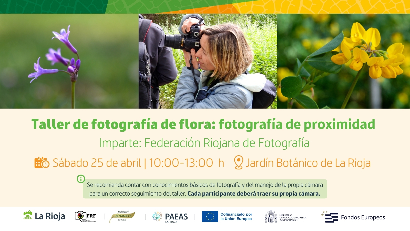 El Gobierno de La Rioja, a través de la Dirección General de Medio Natural y Paisaje, y en colaboración con la Federación Riojana de Fotografía, ha organizado para el próximo sábado 25 de abril un taller de fotografía de flora en el Jardín Botánico de La Rioja, dirigido a la ciudadanía interesada en la fotografía de naturaleza.
